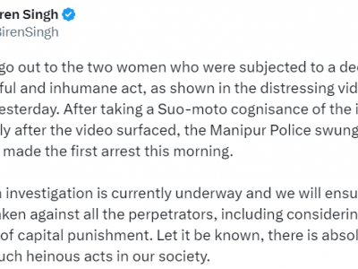 वहीं मुख्यमंत्री बीरेन सिंह ने भी मामले में सख्त कार्रवाई का आश्वासन दिया है। उन्होंने कहा कि वीडियो सामने आने के तुरंत बाद घटना का स्वत: संज्ञान लेते हुए मणिपुर पुलिस हरकत में आई और आज सुबह पहली गिरफ्तारी की गई। मुख्यमंत्री ने कहा कि फिलहाल गहन जांच चल रही है और हम यह सुनिश्चित करेंगे कि सभी अपराधियों के खिलाफ कड़ी कार्रवाई की जाए, जिसमें मृत्युदंड की संभावना पर भी विचार किया जाएगा।