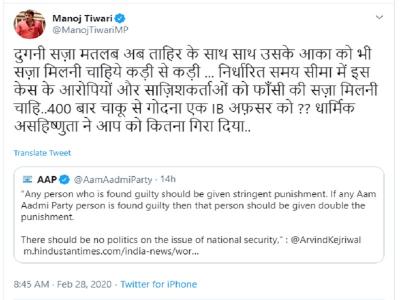 मनोज तिवारी ने आज (28 फरवरी) ट्वीट किया, ''दौगुनी सजा मतलब अब ताहिर के साथ-साथ उसके आका को भी सजा मिलनी चाहिए... कड़ी से कड़ी। निर्धारित समय सीमा में इस केस के आरोपियों और साजिशकर्ताओं को फांसी की सजा मिलनी चाहिए। 400 बार चाकू से गोदना एक आईबी अफसर को?? धार्मिक असहिष्णुता ने आप को कितना गिरा दिया है।'' मनोज तिवारी ने यह ट्वीट आम आदमी पार्टी (AAP) के एक ट्वीट को रिट्वीट करते हुए दिया है।