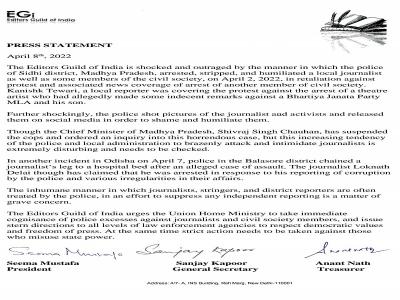 इसके अलावा गिल्ड की ओर से जारी बयान में कहा गया है कि एडिटर्स गिल्ड मध्य प्रदेश के सीधी में पुलिसकर्मियों द्वारा थाने में जिस तरह से पत्रकारों को निर्वस्त्र किया गया है, उसके जानकर हैरान है।