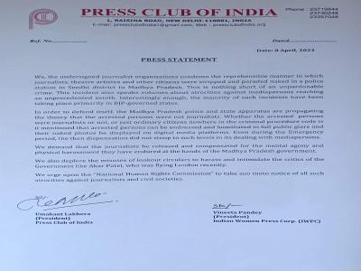 प्रेस क्लब ऑफ इंडिया इस मामले में मांग करता है कि मध्य प्रदेश के सीधी में गिरफ्तार पत्रकारों को फौरन रिहा किया जाए और गिरफ्तारी के दौरान उन्होंने जो मानसिक पीड़ा झेली है उसके लिए मध्य प्रदेश सरकार उन्हें मुआवजा भी दे।