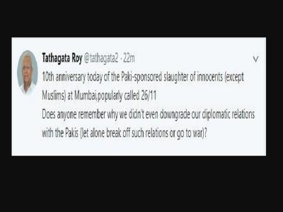 दोपहर तकरीबन एक बजे तथागत रॉय ने पोस्ट किया'आज मुंबई में पाकिस्तान की मदद से हुए मासूमों के नरसंहार (मुस्लिमों को छोड़कर) की 10वीं बरसी है, जिसे 26/11 कहा जाता है। क्या किसी को याद है कि हमने पाकिस्तान के साथ अपने कूटनीतिक संबंध जरा भी कम किए हैं (या तो खुद ये संबंध तोड़े जाएं या तो युद्ध के लिए तैयार रहें)?'