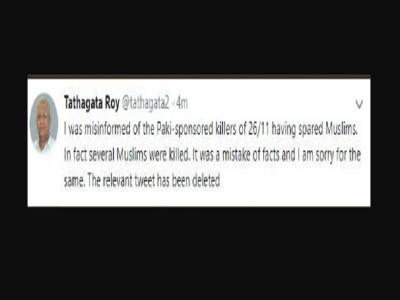 ट्वीट को विवादों में आने के बाद मेघालय गवर्नर तथागत रॉय ने माफी मांगते हुए ट्वीट किया, 'मुझे गलत जानकारी दी गई थी कि 26/11 हमलों में पाकिस्तानी आतंकियों द्वारा मुस्लिमों को छोड़ दी जाए। कई मुस्लिमों ने इस हमले में अपनी जान गंवाई। यह एक तथ्यों से जुड़ी गलती थी और मैं इसके लिए माफी मांगता हूं। वह ट्वीट डिलीट कर दिया गया है।'