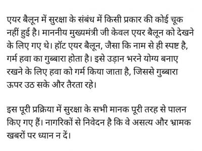 हॉट एयर बैलून, जैसा कि नाम से ही स्पष्ट है, गर्म हवा का गुब्बारा होता है। इसे उड़ान भरने योग्य बनाए रखने के लिए हवा को गर्म किया जाता है, जिससे गुब्बारा ऊपर उठ सके और तैरता रहे। इस पूरी प्रक्रिया में सुरक्षा के सभी मानक पूरी तरह से पालन किए गए हैं। नागरिकों से निवेदन है कि वे असत्य और भ्रामक खबरों पर ध्यान न दें।