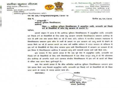 मोहम्मद अली जिन्ना की तस्वीर मामले में खत लिखने वाले सांसद सतीश कुमार गौतम ने एक बार फिर एएमयू वीसी को खत लिखा है। उन्होंने खत लिखकर पूछा है कि उनके लोकसभा क्षेत्र में स्थित केंद्रीय विश्वविद्यालय में एससी, एसटी और ओबीसी के छात्रों को प्रवेश में आरक्षण क्यों नहीं दिया जा रहा है'। सवाल उठाते हुए उन्होंने कहा कि एएमयू में वंचित वर्ग को आरक्षण के लिए विश्वविद्यालय प्रशासन ने अब तक क्या कोशिशें की गई हैं। सांसद के इस खत ने सुर्खियां बटोर ली हैं।