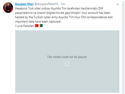 रिपोर्ट में बताया गया है कि हैकर्स ने अनुपम खेर के अकाउंट से एक के बाद एक कई ट्वीट किए हैं। सभी ट्वीट्स में 'आई सपॉर्ट तुर्की' और 'आई लव पाकिस्तान' लिखा गया है। इसके अलावा एक ट्वीट में तुर्की का झंडा, बंदूक पकड़े आतंकी और मिसाइलें दिखाई दे रही हैं। हालांकि इसकी कोई पुष्टि नहीं की गई है।