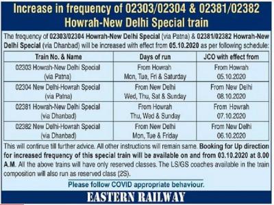 साथ ही 7 अक्टूबर से हावड़ा जंक्शन से धनबाद होते हुए नई दिल्ली की ओर जाने वाली पूर्वा एक्सप्रेस (02381) बुधवार, गुरुवार और रविवार को चलेगी। यही नहीं 8 अक्टूबर से नई दिल्ली से पटना होते हुए हावड़ा जंक्शन जाने वाली पूर्वा एक्सप्रेस (02304) बुधवार, गुरुवार, शनिवार और रविवार को भी चलेगी।