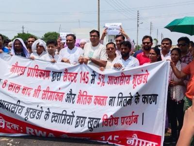 Noida Authority News: नोएडा सेक्टर 145 की रेजिडेंट वेलफेयर एसोसिएशन (आरडब्ल्यूए) द्वारा आयोजित विरोध प्रदर्शन ने सभी का ध्यान आकर्षित किया। इस अनूठे प्रदर्शन में प्लॉट मालिकों ने नोएडा प्राधिकरण की अनुचित देरी के खिलाफ अपनी आवाज़ बुलंद की और दर्शाया की प्राधिकरण और जिला प्रशासन उन्हें और उनकी मांगो को हलके में न ले। प्रदर्शनकारी, जिनमें वरिष्ठ नागरिक, पुरुष, महिलाएं और बच्चे शामिल थे, उस साइट पर एकत्रित हुए जहां पर उनको प्लाट सौपे जाने है।