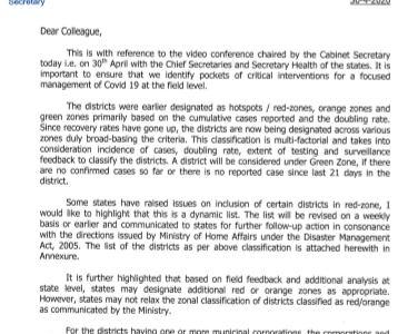 इसके अलावा पत्र में हाटस्पॉट जिलों को नियंत्रित करने के लिए आवश्यक कार्रवाई की जाए। साथ ही, ये भी कहा गया है कि इन क्षेत्रों में मेडिकल एमरजेंसी और आवश्यक सामान व सेवाओं के अलावा किसी को भी आने-जाने की अनुमति न दी जाए। इसके साथ ही, राज्य सरकारों से ये भी अपील की गई है कि वे संभावित कोविड-19 (COVID-19) मामलों की पहचान करने के लिए डोर-टू-डोर स्क्रीनिंग करें और उन्हें जल्द से जल्द अलग करें।