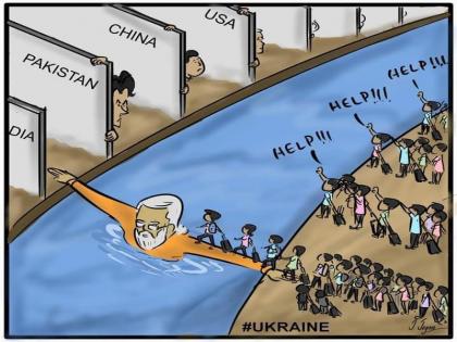 इस पिक्चर में ब्रिज बने भारतीय प्रधानमंत्री नरेंद्र मोदी के हाथों के ऊपर से भारतीय छात्र चढ़कर इंडिया की ओर पहंच रहे हैं। जबकि पाकिस्तान, चीन और अमेरिका के छात्र अपनी सरकारों से मदद मांग रहे हैं लेकिन उनकी सरकार मूकदर्शक बनकर तमाशा देख रही है। इस पिक्चर का संदेश साफ है कि भारत सरकार, अन्य देशों की अपेक्षा आगे आकर अपने देश के छात्रों की मदद कर रही है।