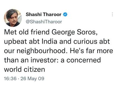 थरूर ने पहले जॉर्ज सोरोस को लेकर ट्वीट करते हुए साल 2009 में लिखा था, "पुराने मित्र जॉर्ज सोरोस से मिले जो भारत के बारे में उत्साहित हैं और हमारे पड़ोस के बारे में उत्सुक हैं। वह एक निवेशक से कहीं अधिक है: एक सम्मानित विश्व नागरिक।"
