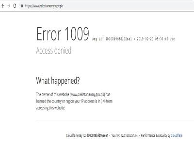 पाकिस्तानी आर्मी की इस वेबसाइट (www.pakistanarmy.gov.pk) को खेलने पर पेज पर 'एक्सेस डिनायड' लिखा जाता है। साथ ही इसमें लिखा है कि इस वेबसाइट का मालिकाना हक रखने वाले ने इसे आपके देश या क्षेत्र में बैन किया हुआ है।