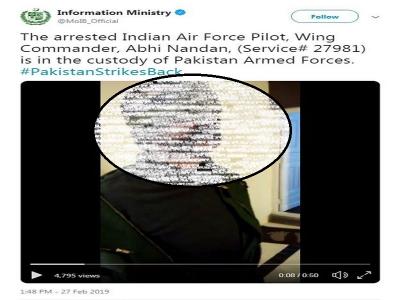 पाकिस्तानी सेना ने दो भारतीय पायलटों को गिरफ्तार करने का दावा किया है। वीडियो में भारतीय वायु सेना की वर्दी पहने व्यक्ति की आंखों पर पट्टी बंधी है। यह व्यक्ति खुध को विंग कमांडर बताते हुए अपना नाम अभिनंदन बता रहा है। इस वीडियो को पहले पाकिस्तानी सूचना मंत्रालय के आधिकारिक ट्वीटर हैंडल से पोस्ट किया गया था। लेकिन कुछ मिनट बाद इसे हटा दिया गया।