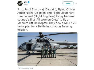 देश में पहली बार ऐसा हुआ है जब भारतीय वायुसेना विमान के क्रू मेंबर्स में सभी महिलाएं हैं। भारतीय वायु सेना की तीन महिला अधिकारियों ने इतिहास रच दिया। वे मीडियम लिफ्ट हेलीकॉप्टर को उड़ाने वाली पहली 'All women crew' (ऑल वीमन क्रू) बन गईं। उन्होंने बैटल इनोक्यूलेशन ट्रेनिंग मिशन के तहत Mi-17V5 चॉपर उड़ाया।