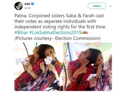 बिहार विधानसभा चुनाव 2015 में सबा और फराह ने एक ही पहचानपत्र पर मतदान किया था। लेकिन लोकसभा चुनाव 2019 में एक शानदार तस्वीर सामने आई है। अभी तक एक ही नागरिक के तौर पर वोट करने वाली सिर से जुड़ी दो बहनों ने इस बार अलग-अलग मतदान किया। चुनाव आयोग ने सबा और फराह की तस्वीरें शेयर करते हुए इस बात की जानकारी दी है।