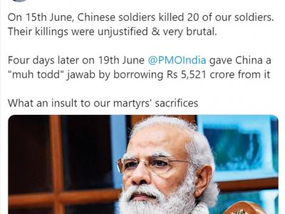 ओवैसी ने अपने आधिकारिक ट्विटर हैंडल पर लिखा, '15 जून को चीनी सैनिकों के साथ झड़प में 20 भारतीय जवानों ने अपनी जान गंवा दी। उनके साथ अन्यायपूर्ण और निर्मम बर्ताव किया गया। चार दिनों बाद, 19 जून को प्रधानमंत्री ने चीन से 5,521 करोड़ उधार लेकर उसे 'मुंहतोड़ जवाब' दे दिया। यह हमारे जवानों के बलिदान का अपमान है।'