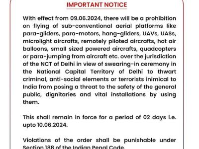 IMPORTANT NOTICE regarding No-Fly Zone/Prohibition of certain flying objects in the NCT of Delhi in view of swearing-in ceremony.@CPDelhi#DelhiPoliceUpdatespic.twitter.com/4xCSdzincd