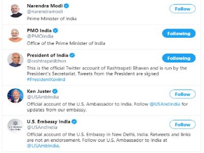 व्हाइट हाउस ने ट्विटर पर प्रधानमंत्री नरेंद्र मोदी, प्रधानमंत्री कार्यालय (PMO INDIA), राष्ट्रपति भवन, अमेरिका में भारतीय दूतावास और भारत में अमेरिकी दूतावास को फॉलो किया है। इनके अलावा भारत में अमेरिका के राजदूत केन जस्टर को भी फॉलो किया गया है।
