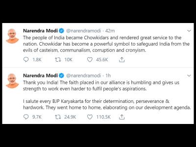 एक अन्य ट्वीट में उन्होंने कहा कि भारत के लोगों ने चौकीदार बन राष्ट्र सेवा किया। चौकीदार, भारत को जातिवाद, सांप्रदायिकता, भ्रष्टाचार और बुराईयों से बचाने का शक्तिशाली प्रतीक बन गया है।