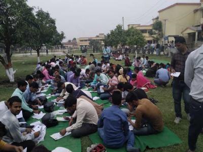 प्राप्त जानकारी के अनुसार भवन और सीट के अभाव में जीएस की परीक्षा परीक्षार्थी बरामदे, जमीन और सीढ़ी के नीचे बैठकर दी. जिले के रामलखन सिंह महाविधालय में स्नातक पार्ट-3 के जीएस विषय की परीक्षा दो पालियों में आयोजित की गई, लेकिन कालेज में क्षमता से अधिक परीक्षार्थीयों का सेन्टर दे दिया गया. जिसके बाद यह तस्वीर देखने को मिली.