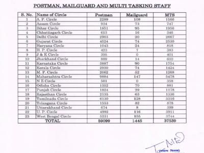 इनके साथ ही आशुलिपिक से संबंधित पदों को भी सर्कल-वार स्वीकृत किया गया है। आंध्र प्रदेश में पोस्टमैन के 2289 पद, मेल गार्ड के 108 पद और एमटीएस के 1166 पद स्वीकृत किए गए हैं। तेलंगाना सर्कल के तहत 1553 पोस्टमैन, 82 मेल गार्ड और 878 एमटीएस स्वीकृत किए गए हैं।