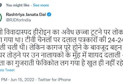 राजद ने ट्वीट में लिखा- किसी विवादास्पद हीरोइन का अवैध छज्जा टूटने पर लोकतंत्र खतरे में आ गया था। टीवी चैनलों पर दलाल पत्रकारों की 24-24 घंटे रुदाली चली थी। लेकिन कागज पूरे होने के बावजूद बहन आफरीन का घर तोड़ने पर उन नालायको के मुँह में शायद दलाली और नीचता का गुजराती फेविकोल लग गया है खुल ही नहीं रहे।