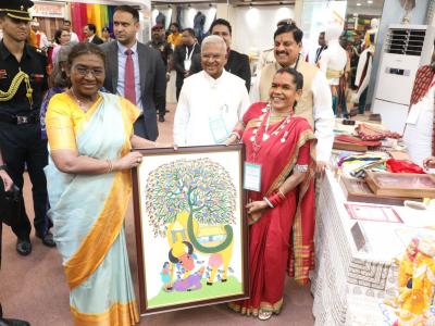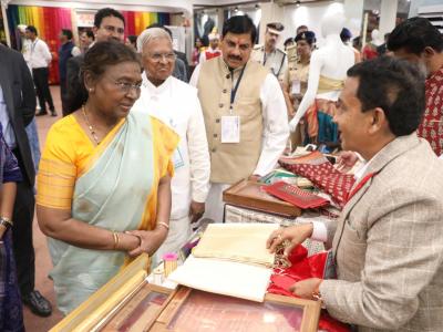 इस अवसर पर राज्यपाल श्री मंगुभाई पटेल, मुख्यमंत्री डॉ. मोहन यादव तथा लघु उद्योग निगम के प्रबंध संचालक एवं सूक्ष्म लघु एवं मध्यम उद्यम विभाग के सचिव डॉ. नवनीत मोहन कोठारी भी उपस्थित थे। राष्ट्रपति श्रीमती मुर्मू ने इन कलाकारों से चर्चा के दौरान कहा कि हमारी पुरानी संस्कृति एवं परम्परा को संजो कर एवं संरक्षित रखने की जरूरत है। यह कलाकार इसमें अच्छा योगदान दे रहे हैं। इन्हें प्रोत्साहन देने की जरूरत है। जिससे इन कलाकारों को रोजगार के अवसर मिल सकेंगे। राष्ट्रपति श्रीमती मुर्मू को इन सभी कलाकारों ने अपने द्वारा निर्मित सामग्री भेंट दी। राष्ट्रपति श्रीमती मुर्मू ने इन कलाकारों के आग्रह पर उनके साथ तस्वीर भी खिंचवाई।