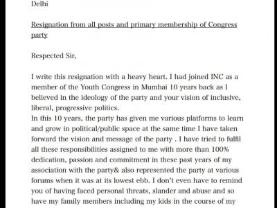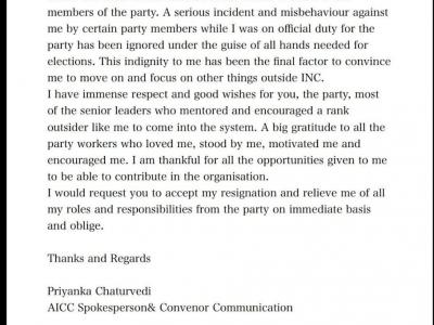 प्रियंका चतुर्वेदी ने इस्तीफे में राहुल गांधी को संबोधित करते हुए लिखा, 'मैं ये इस्तीफा बेहद भारी मन से लिख रही हूं। मैंने 10 साल पहले यूथ कांग्रेस के साथ शुरुआत की थी। मैं पार्टी की लिबरल, प्रोग्रेसिव और इंक्लूसिव राजनीतिक विचारधारा से प्रभावित थी। मैंने इन वर्षों के दौरान जी-जान से पार्टी की सेवा की है और बदले में किसी पुरस्कार की चाहत नहीं की।'