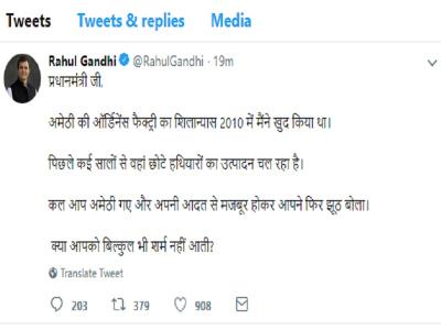 राहुल गांधी ने सोमवार ट्वीट कर लिखा, प्रधानमंत्री जी, अमेठी की ऑर्डिनेंस फैक्ट्री का शिलान्यास 2010 में मैंने खुद किया था। पिछले कई सालों से वहां छोटे हथियारों का उत्पादन चल रहा है। कल आप अमेठी गए और अपनी आदत से मजबूर होकर आपने फिर झूठ बोला। क्या आपको बिल्कुल भी शर्म नहीं आती?