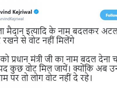 नई दिल्ली, 25 अगस्तः दिल्ली के मुख्यमंत्री अरविंद केजरीवाल ने भारतीय जनता पार्टी को अपने प्रधानमंत्री का नाम बदलने की नसीहत दे डाली। शनिवार को एक ट्वीट में लगातार प्रतिष्ठानों का नाम बदलने की खबरों के बीच अरविंद केजरीवाल ने कहा, 'रामलीला मैदान इत्यादि के नाम बदलकर अटल जी के नाम पर रखने से वोट नहीं मिलेंगे। भाजपा को प्रधान मंत्री जी का नाम बदल देना चाहिए। तब शायद कुछ वोट मिल जायें। क्योंकि अब उनके अपने नाम पर तो लोग वोट नहीं दे रहे।' गौरतलब है कि राजधानी दिल्ली स्थित रामलीला मैदान का नाम पूर्व प्रधानमंत्री अटल बिहारी वाजपेयी के नाम पर करने की योजना है।