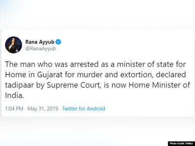 अमित शाह को गृहमंत्री बनाए जाने के बाद खोजी पत्रकार राना अय्यूब ने कहा कि गुजरात के गृहराज्य मंत्री रहते हुए हत्या और फिरौती के आरोप में अरेस्ट और सुप्रीम कोर्ट द्वारा तड़ीपार घोषित आदमी अब भारत का गृहमंत्री है। हालांकि राना अय्यूब ने अपने ट्वीट में कहीं भी अमित शाह के नाम का जिक्र नहीं किया है। लेकिन उनके ट्वीट का इशारा अमित शाह की तरफ ही है।