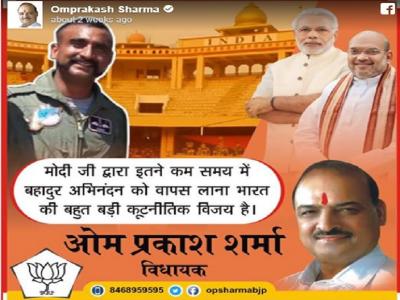 फेसबुक पर शेयर की एक तस्वीर में बीजेपी नेता ओ पी शर्मा ने अभिनंदन वर्तमान की तस्वीर को प्रधानमंत्री नरेन्द्र मोदी और बीजेपी अध्यक्ष के साथ शेयर कर लिखा है कि 'मोदी जी द्वारा इतने कम समय में बहादुर अभिनंदन को वापस लाना भारत की बहुत बड़ी कूटनीतिक विजय है।'