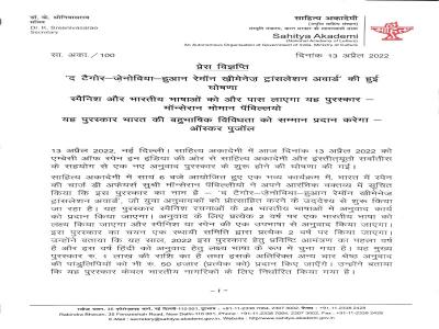 साहित्य अकादमी ने स्पेन की इंडियन एम्बेसी की सहायता से अनुवाद के क्षेत्र में पुरस्कार की घोषणा की