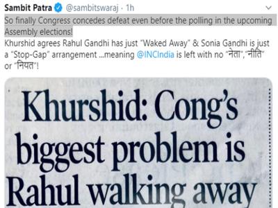 बीजेपी के राष्ट्रीय प्रवक्ता संबित पात्रा ने ट्वीट करते हुए लिखा, 'अच्छा आखिरकार कांग्रेस ने आगामी विधानसभा चुनाव में मतदान से पहले ही हार मान ली है! खुर्शीद इस बात से सहमत हैं कि राहुल गांधी के राहुल गांधी 'छोड़ गए' और सोनिया गांधी सिर्फ 'फौरी इंतजाम' देख रही हैं। इसका मतलब है कि कांग्रेस में कोई नेता, नीति और नीयत नहीं बची है।'