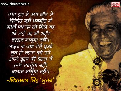 शिवमंगल सिंह सुमन भारत के पूर्व प्रधानमंत्री अटल बिहारी वाजपेयी के पसंदीदा कवियों में थे। अटल जी ने कई बार सार्वजनिक मंचों पर सुमन की "क्या हार में क्या जीत में, किंचित नहीं भयभीत मैं" का पाठ किया था। आगे पढ़िए शिवमंगल सिंह सुमन की 7 प्रसिद्ध कविताओं के अंश।
