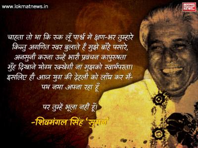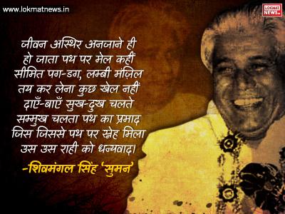 हिन्दी के प्रमुख गीतकार शिवमंगल सिंह सुमन की आज पुण्यतिथि है। शिवमंगल सिंह सुमन का जन्म पाँच अगस्त 1915 को उत्तर प्रदेश (तब संयुक्त प्रांत) के उन्नाव जिले में हुआ था। सुमन ने काशी हिन्दी विश्वविद्यालय (बीएचयू) से हिन्दी साहित्य में एमए और पीएचडी की। बीएचयू ने शिवमंगल सुमन को 1950 में डीलीट की भी उपाधि दी थी।