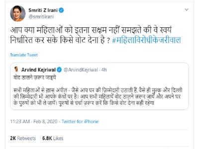 'पुरुषों से चर्चा जरूर करें कि वोट किसे देना है', केजरीवाल के सुझाव पर स्मृति ईरानी का पलटवार- 'क्या महिलाओं को सक्षम नहीं समझते...'