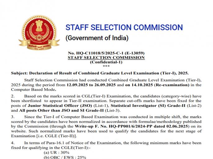 कर्मचारी चयन आयोग (SSC) ने आज 18 दिसंबर 2025 को SSC CGL 2025 टियर-1 परीक्षा का परिणाम घोषित कर दिया है। जिन अभ्यर्थियों ने यह परीक्षा 12 सितंबर से 26 सितंबर 2025 के बीच दी थी, वे अब अपना रिजल्ट आयोग की आधिकारिक वेबसाइट ssc.gov.in पर जाकर देख और डाउनलोड कर सकते हैं। आयोग द्वारा यह परिणाम अक्टूबर में प्राप्त लगभग 1000 आपत्तियों की समीक्षा के बाद जारी किया गया है, जिन्हें 17 से 19 अक्टूबर 2025 के बीच दर्ज किया गया था।