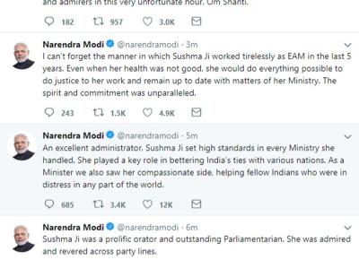 प्रधानमंत्री नरेन्द्र मोदी ने पूर्व विदेश मंत्री सुषमा स्वराज के निधन पर मंगलवार को गहरा दुख व्यक्त किया और कहा कि भारतीय राजनीति के एक गौरवशाली अध्याय का अंत हो गया। मोदी ने ट्वीट किया,‘‘भारतीय राजनीति में एक गौरवशाली अध्याय का अंत हो गया। भारत एक असाधारण नेता के निधन से शोकसंतप्त है, जिन्होंने जनसेवा और निर्धनों के जीवन में सुधार के लिए अपना जीवन समर्पित कर दिया। सुषमा जी अपने आप में अलग थीं और करोड़ों लोगों के लिए प्रेरणास्रोत थीं।’’