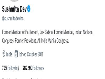 हाल में ट्विटर विवाद के बीच कांग्रेस खेमे से एक और चौंकाने वाली खबर आई है। पूर्व सांसद और महिला कांग्रेस की राष्ट्रीय अध्यक्ष सुष्मिता देव ने पार्टी से इस्तीफा दे दिया है। साथ ही उन्होंने अपना ट्विटर प्रोफाइल भी बदला है। इसमें उन्होंने कांग्रेस पार्टी के पूर्व सदस्य होने की बात लिखी है।