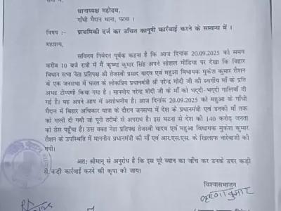 बिहार की राजनीति में तेजस्वी यादव की ‘बिहार अधिकार यात्रा’ के दौरान पीएम मोदी की दिवंगत मां को लेकर की गई कथित अभद्र टिप्पणी पर भाजपा ने गंभीर आपत्ति जताई है। पार्टी ने पटना के गांधी मैदान थाने में तेजस्वी यादव और विधायक मुकेश रोशन के खिलाफ प्राथमिकी दर्ज करवाई है। पटना के गांधी मैदान थाना में यह शिकायत भाजपा प्रदेश कार्यसमिति के सदस्य कृष्ण सिंह कल्लू द्वारा दर्ज कराई गई है।