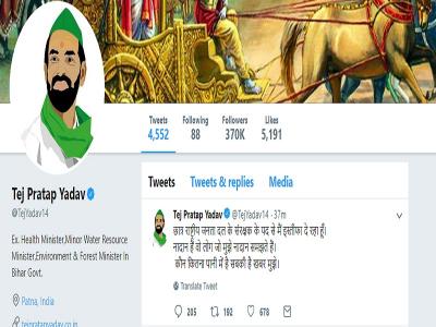 तेज प्रताप ने ट्वीट कर कहा, ''छात्र राष्ट्रीय जनता दल के संरक्षक के पद से मैं इस्तीफा दे रहा हूँ। नादान हैं वो लोग जो मुझे नादान समझते हैं। कौन कितना पानी में है सबकी है खबर मुझे।''