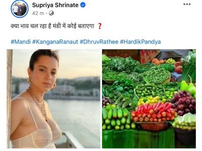 रविवार को हिमाचल प्रदेश की मंडी लोकसभा सीट से अपनी उम्मीदवारी की घोषणा के बाद से बॉलीवुड अभिनेत्री कंगना रनौत एक वर्ग सोशल मीडिया पर निशाना बना रहा है, जिसका नेतृत्व कांग्रेस नेताओं और उनके समर्थकों ने किया। इसमें रनौत पर दी गई यौन टिप्पणियों और गालियों की बौछार शामिल है। इसी श्रृंखला में कांग्रेस की राष्ट्रीय प्रवक्ता सुप्रिया श्रीनेत की अब डिलीट हो चुकी इंस्टाग्राम पोस्ट में उन्होंने कैप्शन के साथ रनौत की एक तस्वीर पोस्ट की, "क्या भाव चल रहा है मंडी में कोई बताएगा?