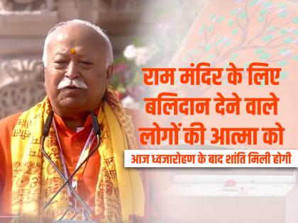 राष्ट्रीय स्वयंसेवक संघ (आरएसएस) के सरसंघचालक मोहन भागवत ने मंगलवार को कहा कि राम मंदिर के लिए बलिदान देने वाले लोगों की आत्मा को आज मंदिर के शिखर पर ध्वजारोहण के बाद शांति मिली होगी। उन्होंने कहा कि अयोध्या में राम मंदिर पर फहराया गया ध्वज उन सिद्धांतों का प्रतीक है जो व्यक्ति, परिवार और दुनिया भर में सद्भाव की प्रेरणा देते हैं। भागवत ने अयोध्या में राम मंदिर के शिखर पर ध्वजारोहण के बाद कार्यक्रम को संबोधित करते हुए कहा कि ध्वज हमेशा एक प्रतीक होता है, और मंदिर में इतने ऊंचे ध्वज को लगाने में काफी समय लगा, ठीक वैसे ही जैसे मंदिर बनने में लगा था। समारोह में प्रधानमंत्री नरेन्द्र मोदी, उत्तर प्रदेश की राज्यपाल आनंदी बेन पटेल और मुख्यमंत्री योगी आदित्यनाथ उपस्थित थे। भागवत ने कहा, ‘‘कई लोगों ने इस दिन का सपना देखा था और कई लोगों ने इसके लिए अपनी जान दे दी।