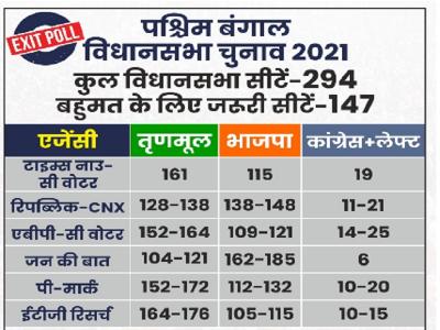 पश्चिम बंगाल में आठवें और आखिरी चरण के मतदान के पूरा होते ही तमाम एजेंसियों के एग्जिट पोल आ रहे हैं। रिपब्लिक-सीएनएक्स के एग्जिट पोल में जहां बंगाल में बीजेपी को सत्ता के करीब दिखाया गया है वहीं टाइम्स नाउ-सीवोटर का सर्वे बीजेपी की चिंता बढ़ा सकता है।