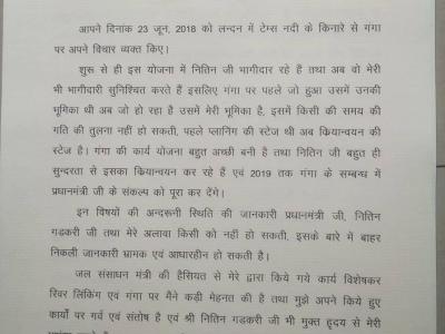 गौरतलब है कि लंदन में एक टीवी चैनल से बातचीत में योगगुरू रामदेव ने गंगा स्वच्छता कार्यक्रम के संदर्भ में एक सवाल के जवाब में कहा था कि उमा जी की फाइल ऑफिस में अटक जाती है जबकि गडकरी जी की फाइल नहीं अटकती। उन्होंने कहा था कि देश में सबसे ज्यादा किसी मंत्री का काम दिखता है तो वह नितिन गडकरी का है।