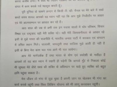 हालांकि उमा भारती के पत्र के बाद रामदेव का भी बयान आया है। उन्होंने एक ट्वीट किया है और अपने बयान पर स्पष्टीकरण दिया है। उन्होंने ट्वीट कर लिखा है, ''पूज्य उमा भारती जी के साथ मेरा आध्यात्मिक भाई-बहन का संबंध है। उनके सम्मान को आहत करने की मेरी कोई मंशा नहीं थी। मेरा मकसद गंगा की कार्ययोजना पर उन्हें आ रही प्रारम्भिक व प्रशासनिक कठिनाइयों की ओर इशारा करना भर था। उनकी गंगा-निष्ठा, धर्म-निष्ठा और राष्ट्र-निष्ठा प्रशंसनीय है।''