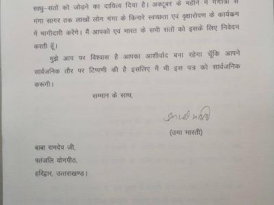 बाबा रामदेव को लिखे पत्र में उमा भारती ने कहा कि मुझे आपके द्वारा गंगा की विवेचना करते समय दो मंत्रियों की तुलना करना अजीब लगा। मैं स्वयं भी नितिन गडकरी जी की प्रशंसक हूं।
