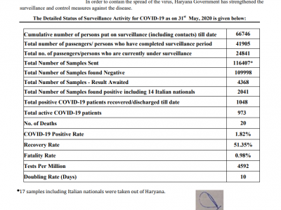 हम इस बारे में आवश्यक दिशा-निर्देश कल तक जारी करेंगे. हरियाणा में कोरोनावा वायरस के कुल संक्रमित मरीज़ों की संख्या 973 है और 971 इलाज के बाद ठीक हो चुके हैं. कोरोना वायरस की वजह से हरियाणा में अब तक 20 लोगों की मौत हुई हैं.