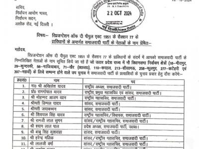UP Assembly Bypolls: सांसद डिंपल यादव और अवधेश प्रसाद तथा जेल में बंद पार्टी के सीनियर नेता आजम खान का भी नाम है.