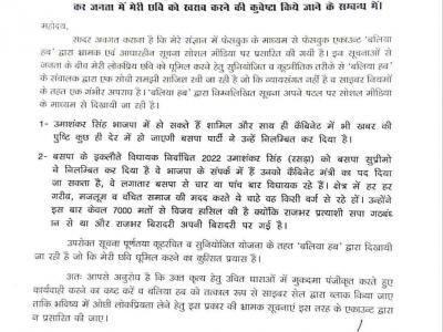 उन्होंने शिकायत में कहा है कि 'बलिया हब' सूचना चला रहा है कगि उन्हें पार्टी ने निलंबित कर दिया है और वह भाजपा के संपर्क में हैं जहां उन्हें कैबिनेट मंत्री का पद दिया जा सकता है। उन्होंने 'बलिया हब' के खिलाफ एफआईआर दर्ज करने और उसे तत्काल प्रभाव से ब्लॉक करने की मांग की है।